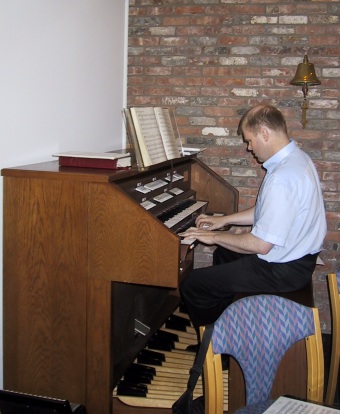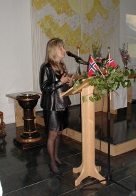 | 2re, Gamle Akers musikalske leder, her intervjuet av Ola, besøkende sjømannsprest, forteller de fremmøtte litt om våre planer under USA-oppholdet. | Roar Hensvold tok utfordringen på strak arm, da han ble forespurt om å traktere kirkeorgelet ettersom den faste organisten måtte svikte arrangementet....og ingen av oss kunne gjort det bedre. |